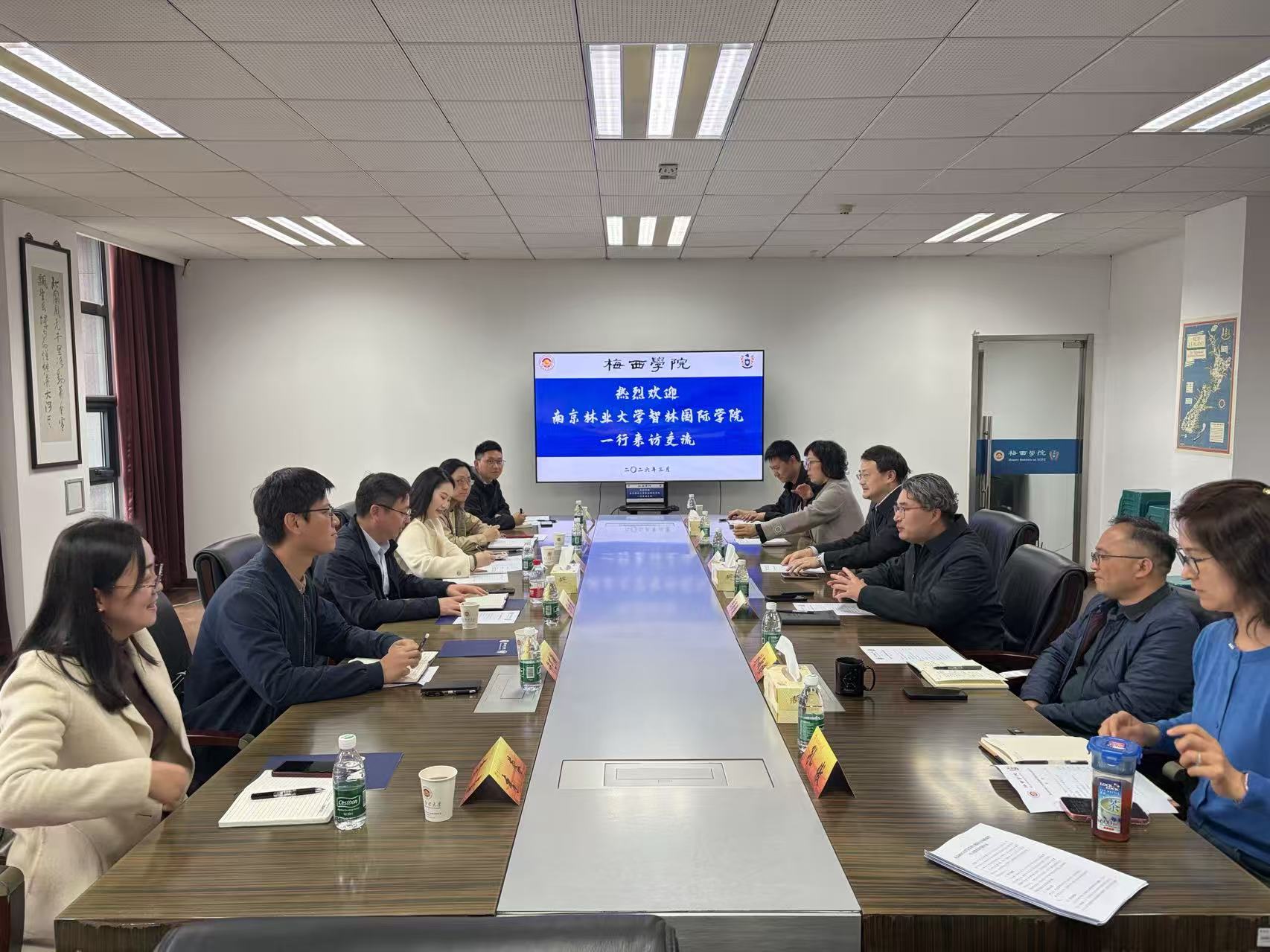 为加快推进中外合作办学机构高质量建设,2026年3月31日,南京林业大学智林国际学院院长杨加猛率队赴南京财经大学梅西学院开展专题调研交流。梅西学院党总支书记张励行、院长陆颖健携全体班子成员及相关科室负责人出席交流会,双方围绕中外合作办学全流程核心议题展开深度研讨。